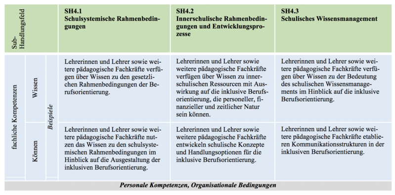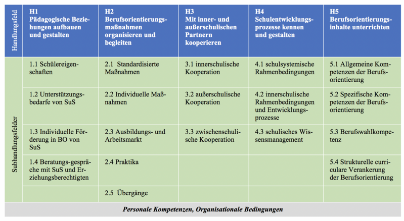 Das Qualifikationstableau wird in verschiedenen Handlungsfeldern Kompetenzen ausweisen, die in der Schule von pädagogischen Fachkräften erfüllt oder für die sie qualifiziert werden müssen, um die Anforderungen einer inklusiven Berufsorientierung erfolgreich bewältigen zu können. Dabei erfolgt eine Systematisierung nach Handlungsfeldern, Wissen und Können.